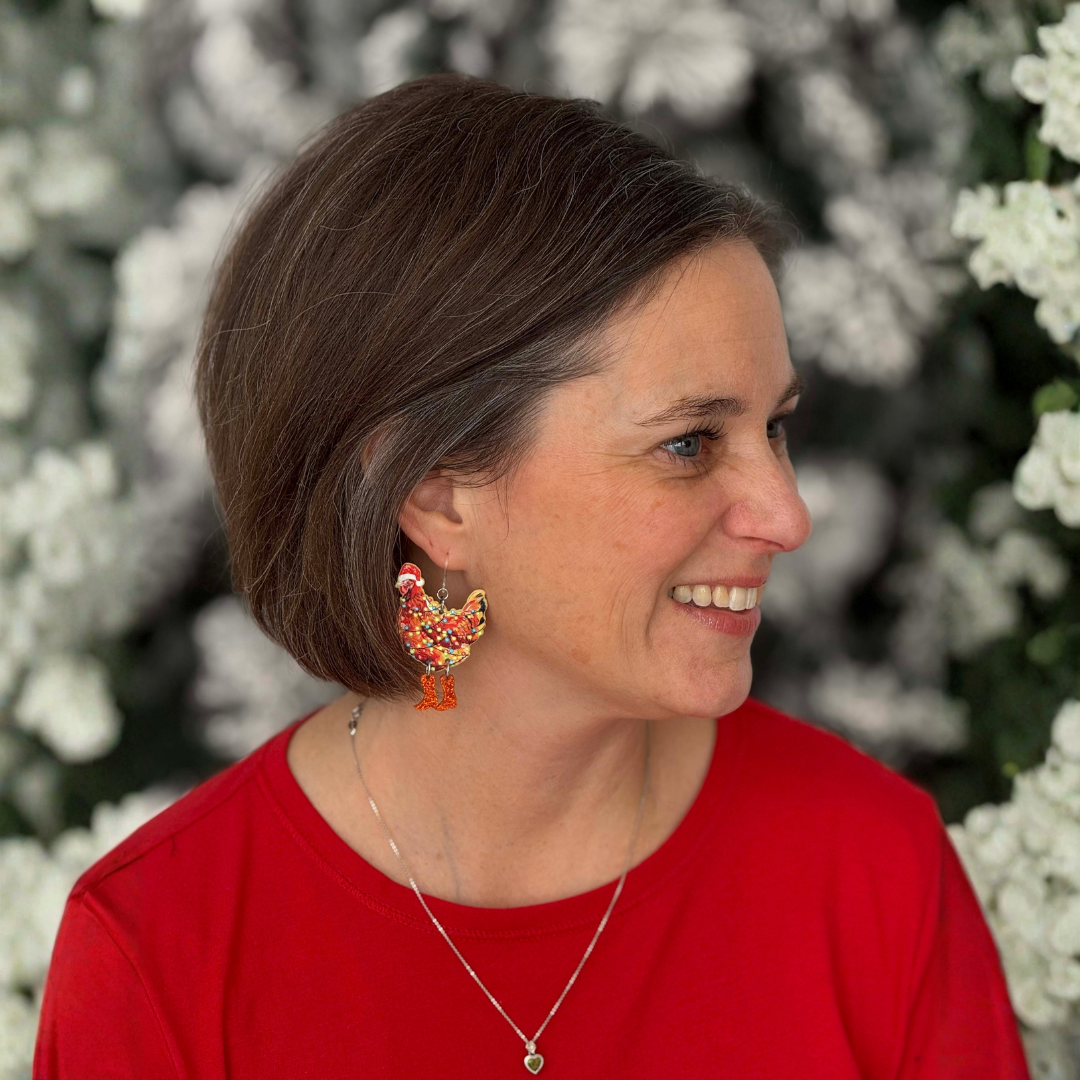 Ring in the holiday season with these outrageous Exaggerated Christmas Chicken Earrings (Dangles)! Made with hypoallergenic plastic hooks for sensitive ears, these birds will put an exclamation point on any holiday outfit! (Don't worry, no actual chickens were harmed!)